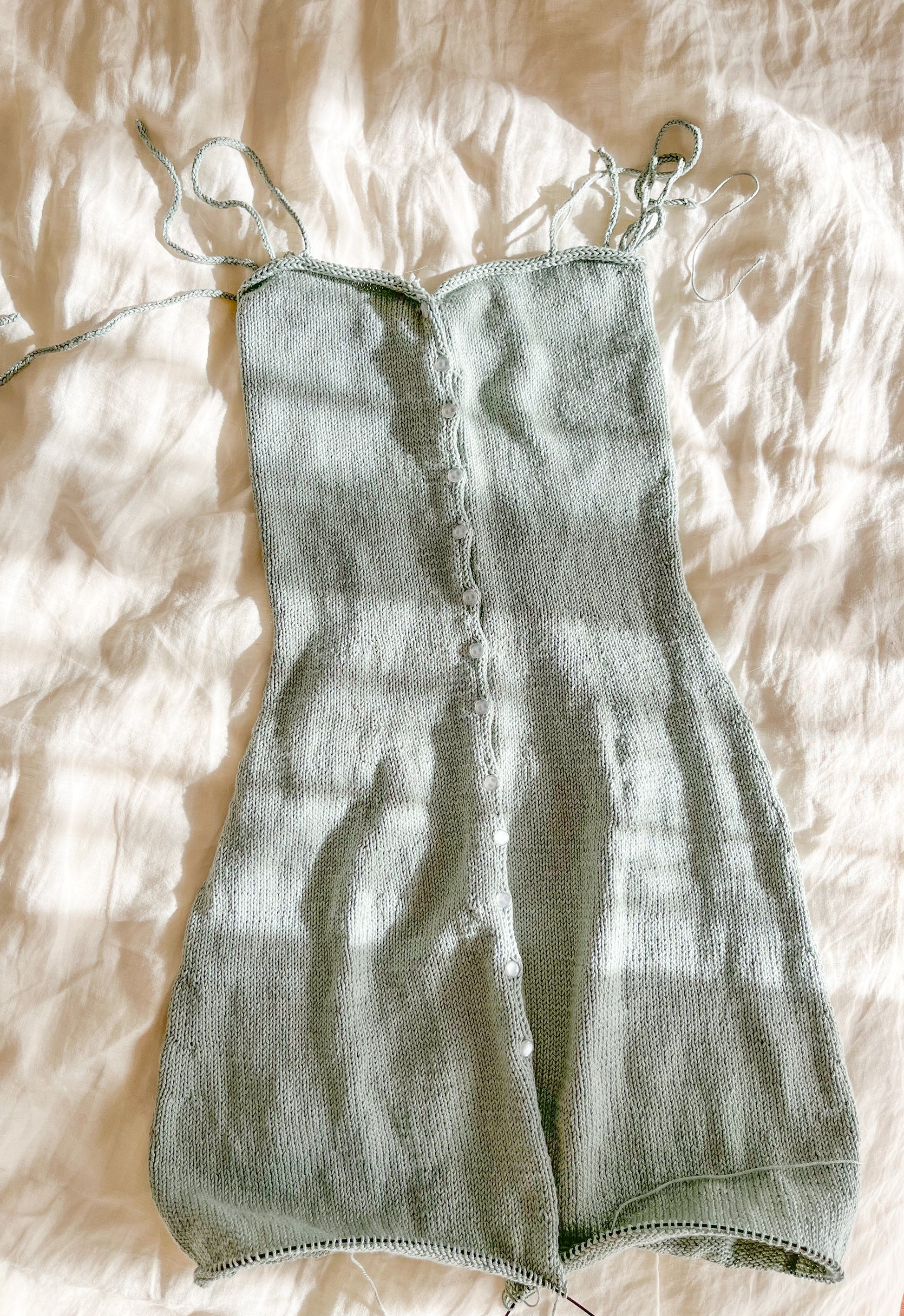 The Daphne Button Up Dress is worked from the top down, beginning with the bust cup shaping and then working the body. The dress is worked back and forth in pattern until the desired length is reached, with and i-cord edging for the edges. The straps are picked up and worked in i-cord and tied up in a fashionable style.