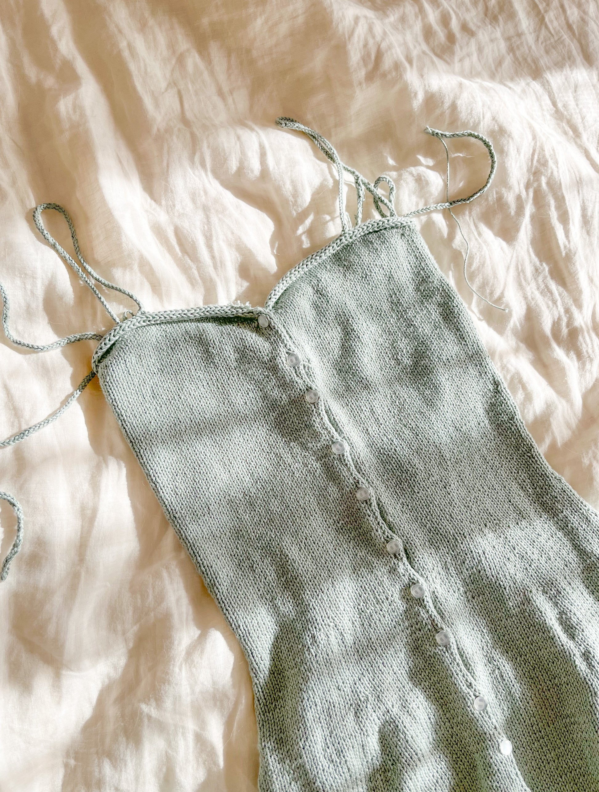 A summery and beautiful summer dress, inspired by Parisian street style mixed with the shaping of a more modern Bridgerton style. This classic and versatile dress features a charming button-up front, making it the perfect choice for any occasion. Worked in an easy to wear bamboo yarn, and finished with a cute button up detail and tie up straps. Embrace a look that's both sophisticated and stylish with the Daphne Button Up Dress, and add to your DIY wardrobe.